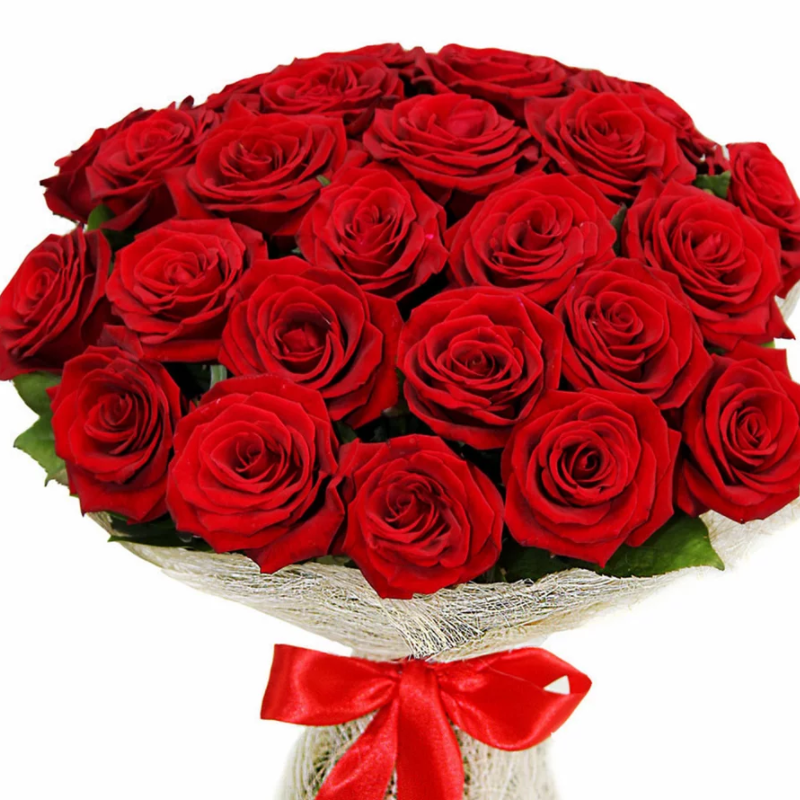 Букет состоит из 25 красных роз, красивая упаковка, атласная лента.