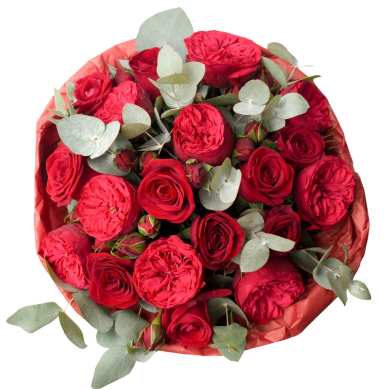 Букет состоит из 15 красных роз, 5 веток кустовых роз Red Piano, эвкалипт, крафт, атласная лента.