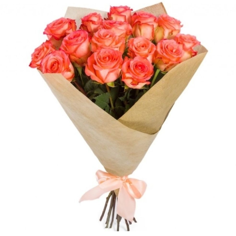 Букет состоит из 19 оранжевых роз, крафт, атласная лента.