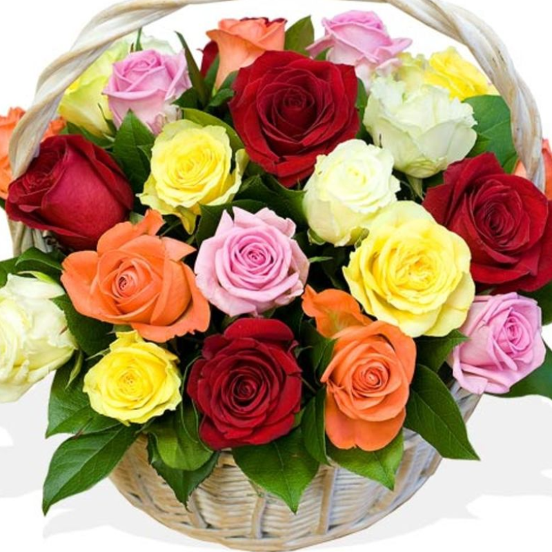 5 красных роз, 5 розовых роз, 5 оранжевых роз, 5 желтых роз, 5 белых роз, зелень, корзина.