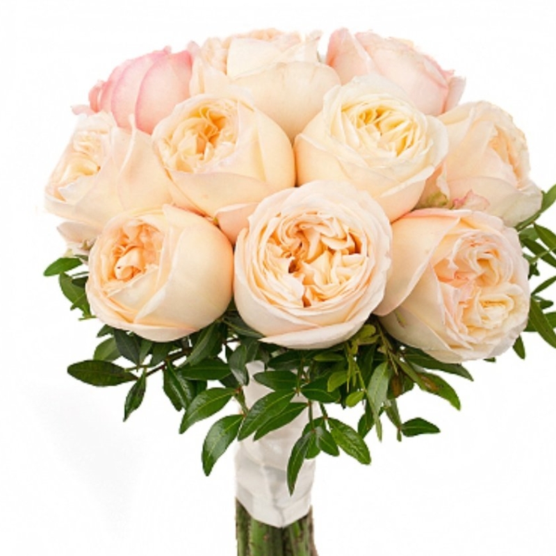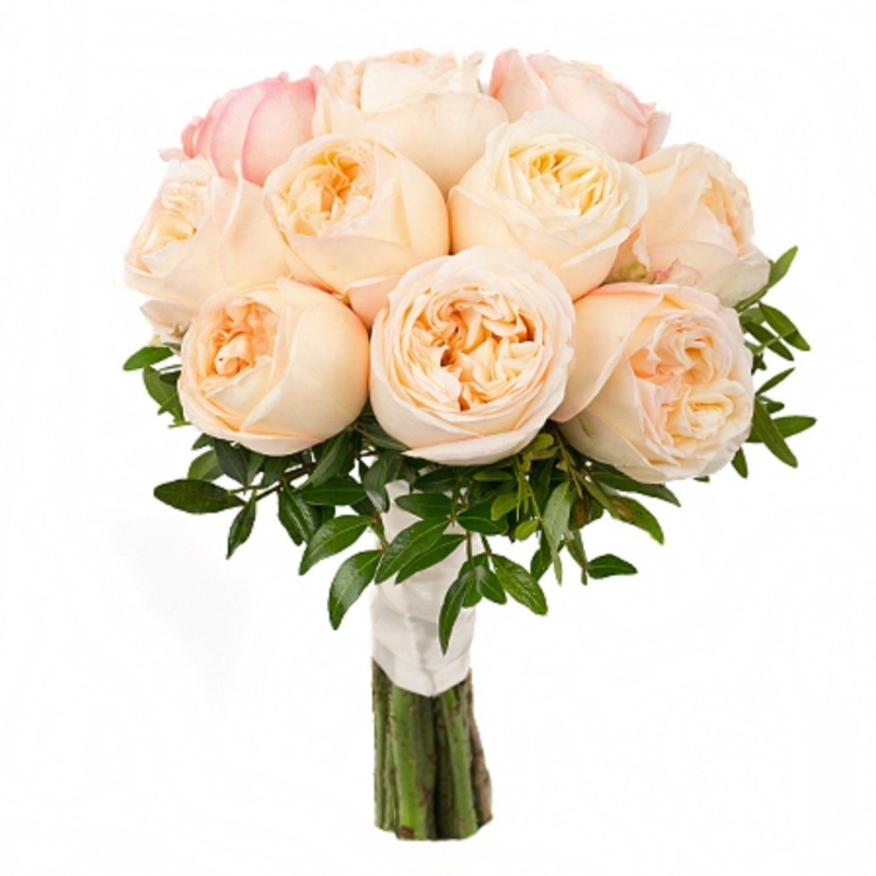 Букет состоит из 11 персиковых пионовидных роз, фисташка, атласная лента.
