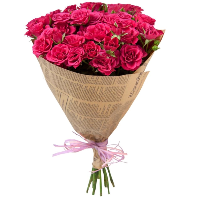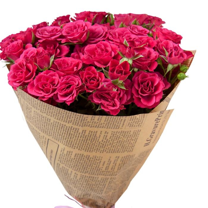 Букет из малиновых кустовых роз в крафте