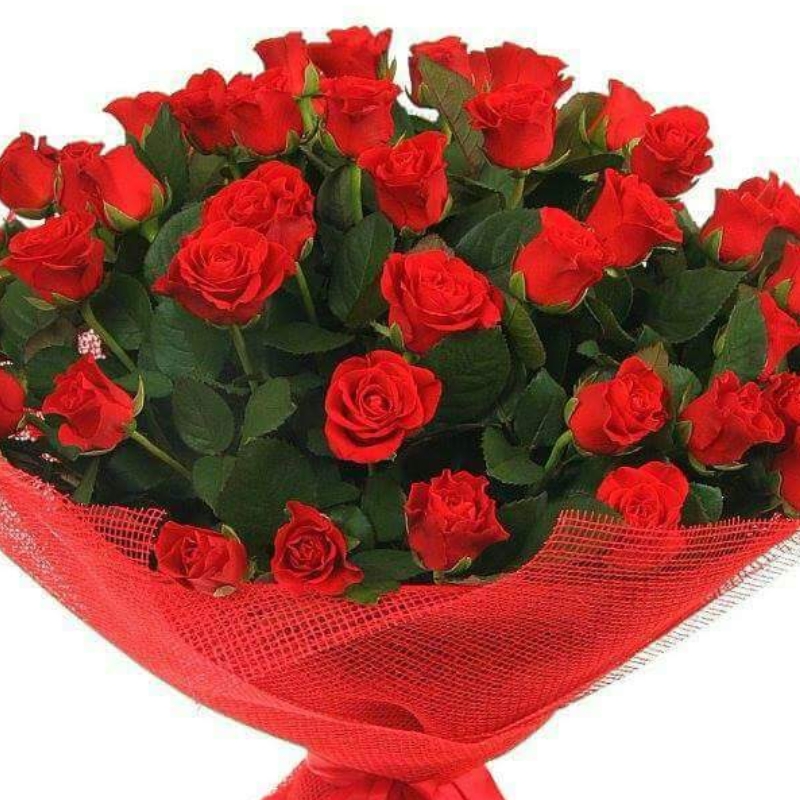 Букет состоит из 35 красных роз, красная упаковка.