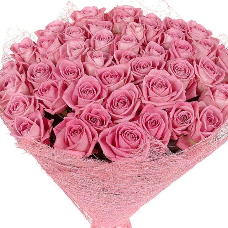 Букет состоит из 55 розовых роз, розовая упаковка, атласная лента.
