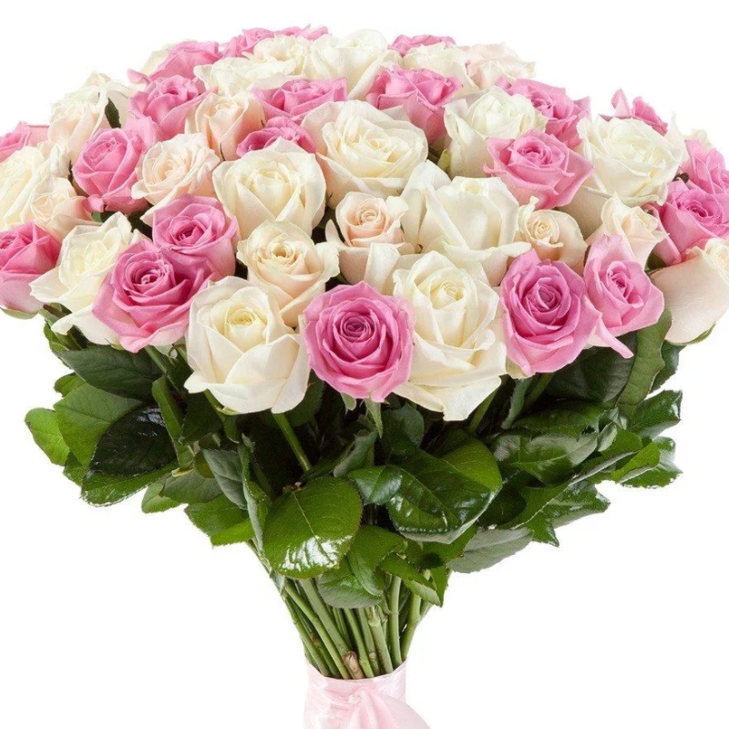 Букет состоит из 23 розовые розы, 22 белые розы, прозрачная упаковка, атласная лента.
