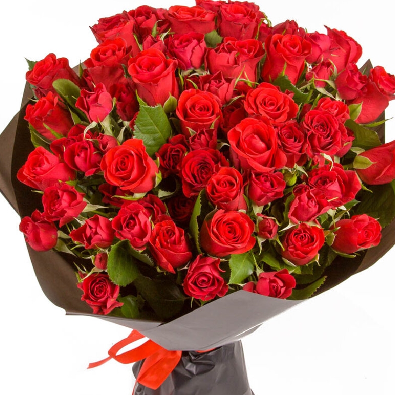 Букет состоит из 15 красных роз, 10 кустовых роз, крафт, атласная лента.
