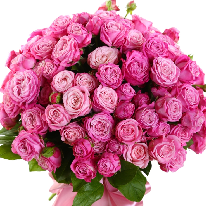 Букет состоит из 25 кустовых пионовидных роз, прозрачная упаковка, атласная лента.