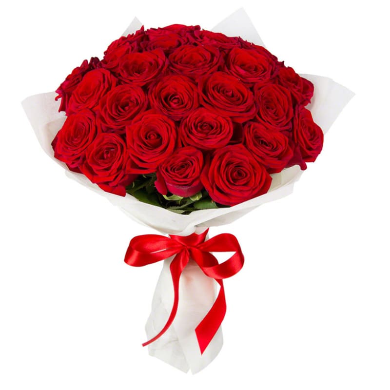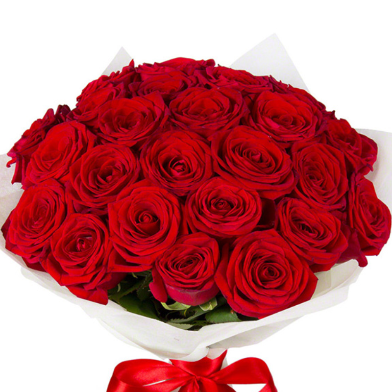 Букет состоит из 25 красных роз, красивая упаковка, атласная лента.