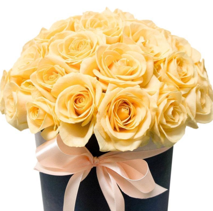 Букет состоит из 25 кремовых роз, коробка, атласная лента.