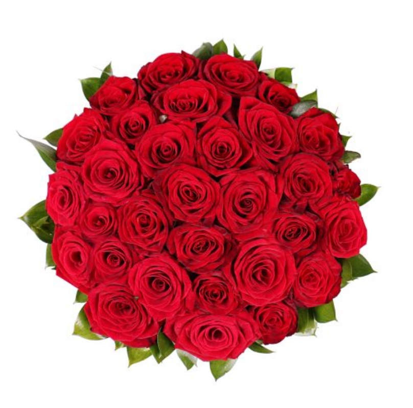 Букет состоит из 35 красных роз, салал, коробка, атласная лента.