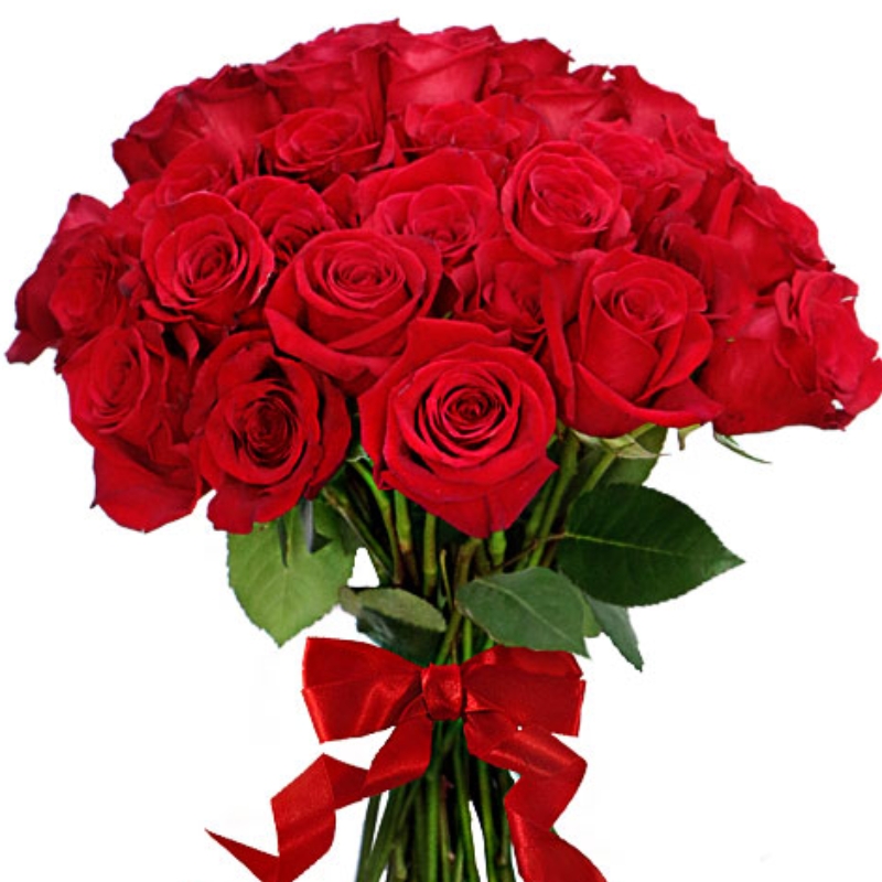 Букет состоит из 27 красных роз, прозрачная упаковка, красная лента.