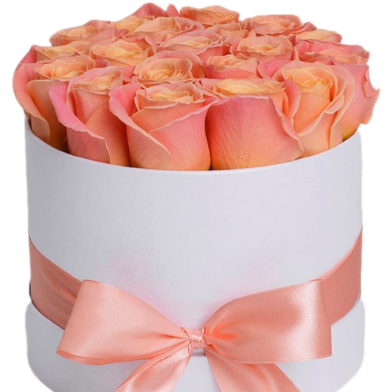 Букет состоит из 21 коралловая роза, коробка, оазис.