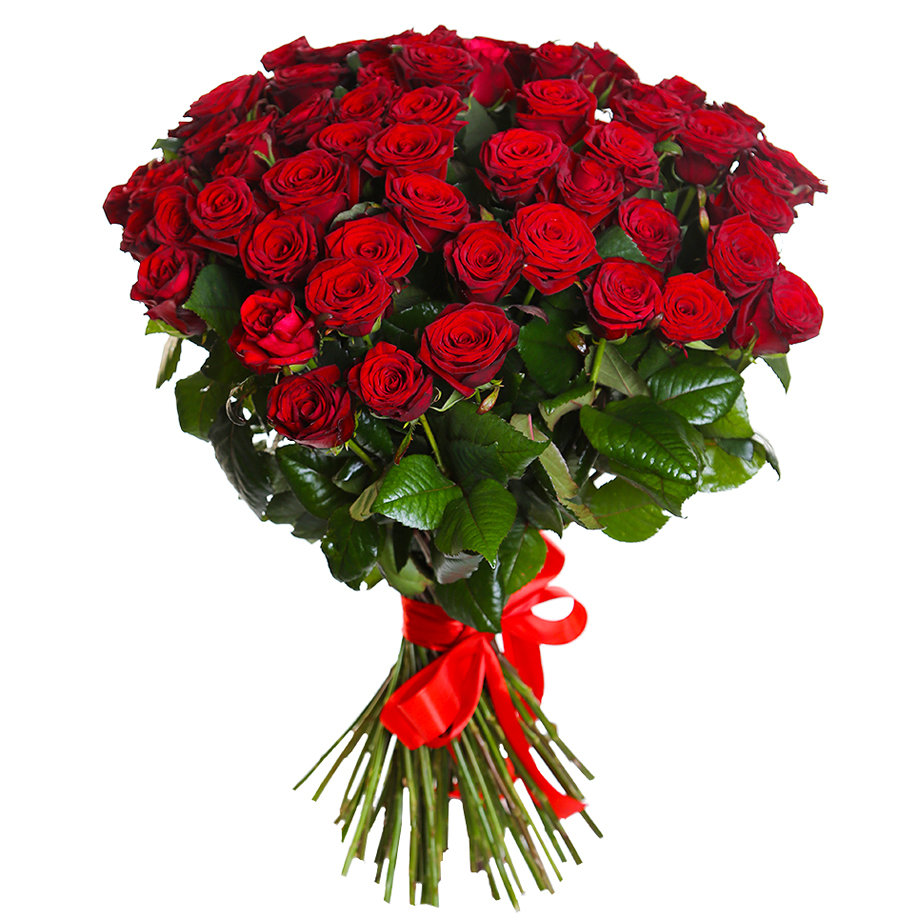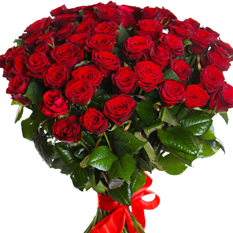 Букет состоит из 51 красная роза, прозрачная упаковка, атласная лента.