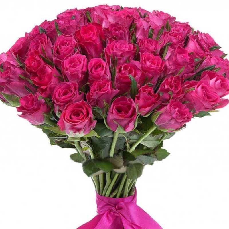 Букет состоит из 51 малиновая роза, зелень, прозрачная упаковка, атласная лента.