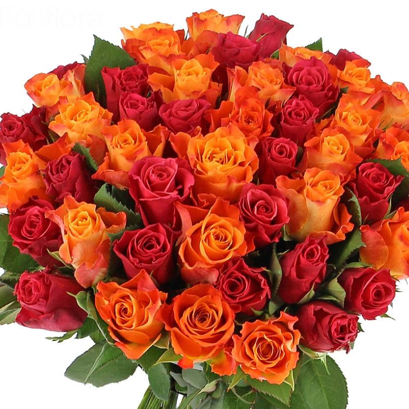 Букет состоит из 26 красных роз, 25 оранжевых роз, прозрачная упаковка, атласная лента.