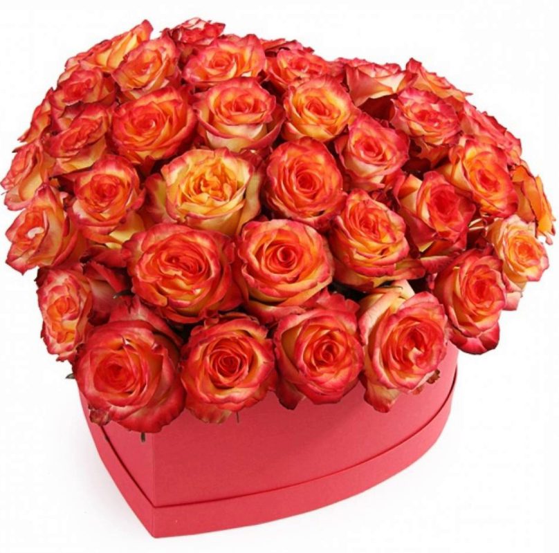 Букет состоит из 35 оранжевых роз, коробка в виде сердца.