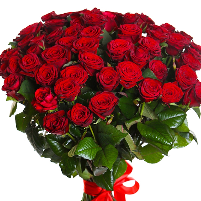 Букет состоит из 55 красных роз, прозрачная упаковка, красная лента.