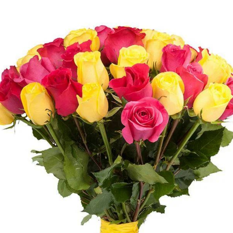 Букет состоит из 16 розовых роз, 15 желтых роз, прозрачная упаковка, атласная лента.