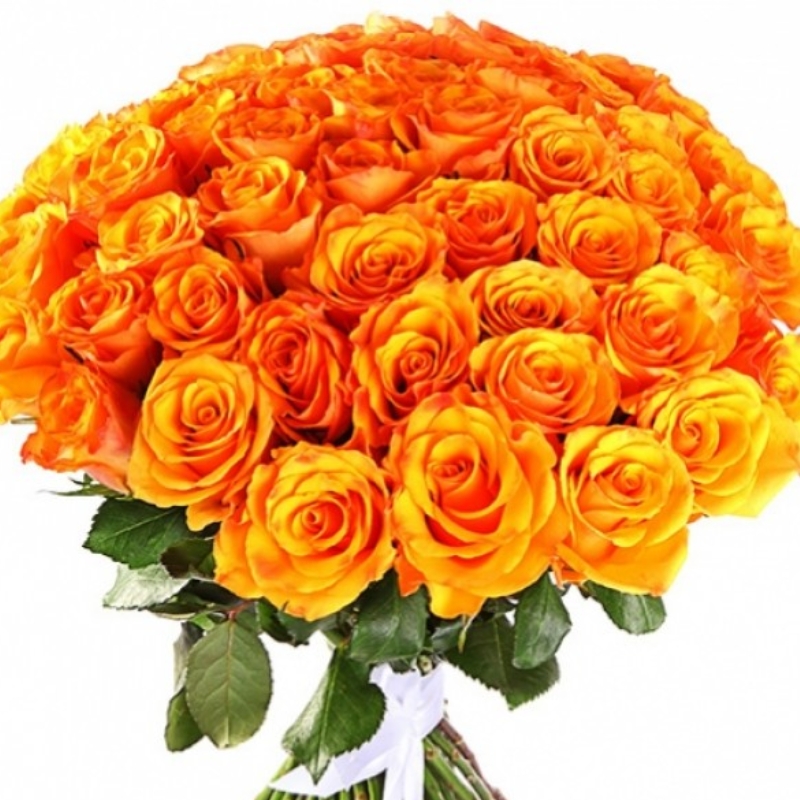 Букет состоит из 51 оранжевая роза, прозрачная упаковка, атласная лента.