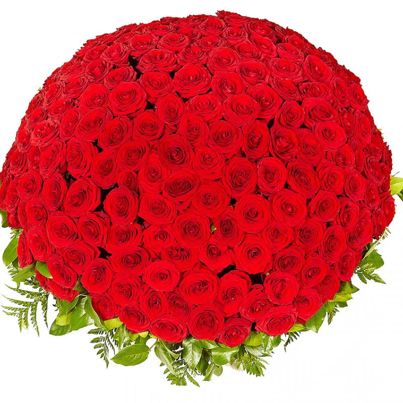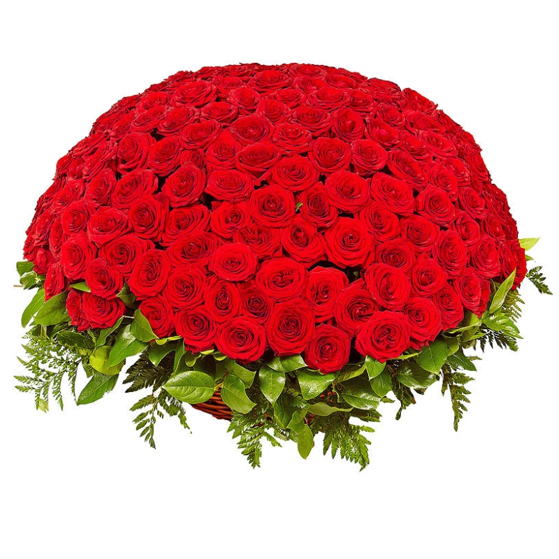 Букет состоит из 201 красная роза, зелень, корзина, оазис.