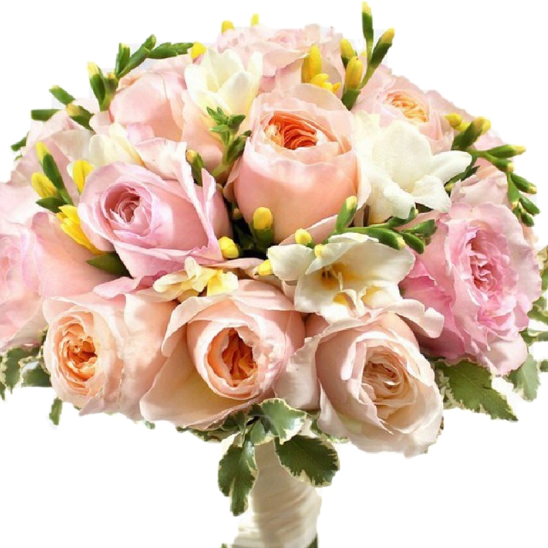 Букет состоит из 15 роз, 4 ветки фрезий, зелень, атласная лента.
