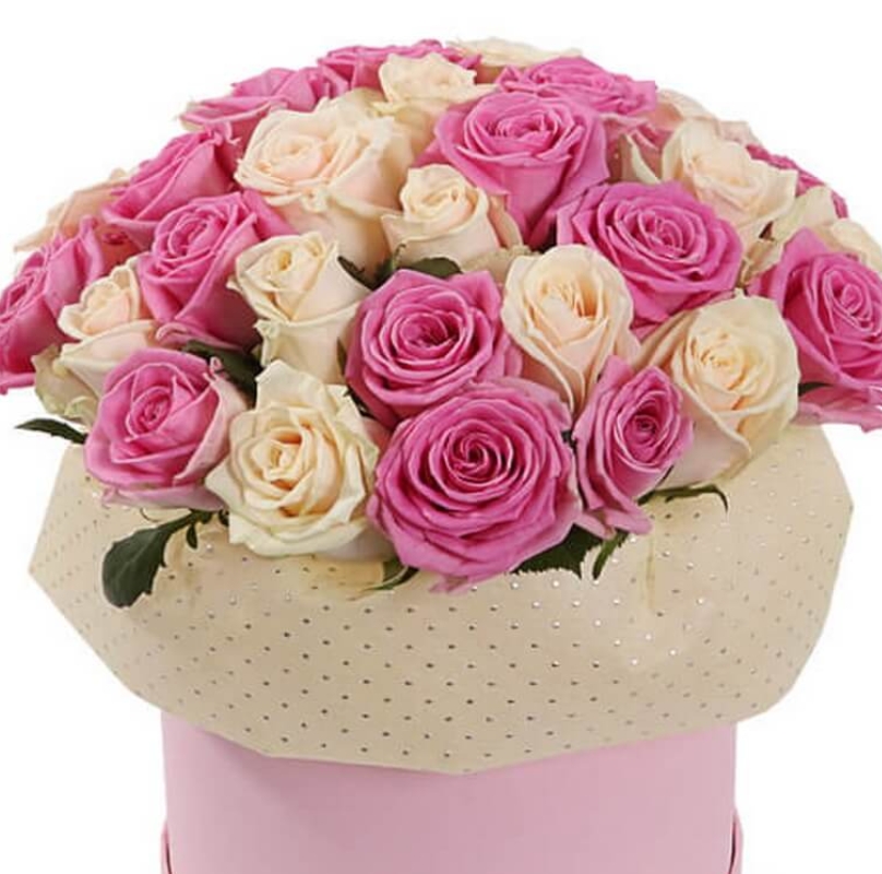 Букет состоит из 35 розовых и кремовых роз, коробка.