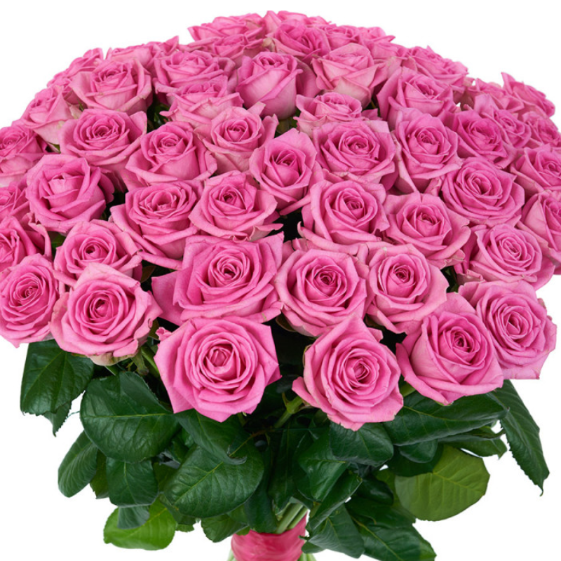 Букет состоит из 51 розовая роза, прозрачная упаковка, атласная лента.