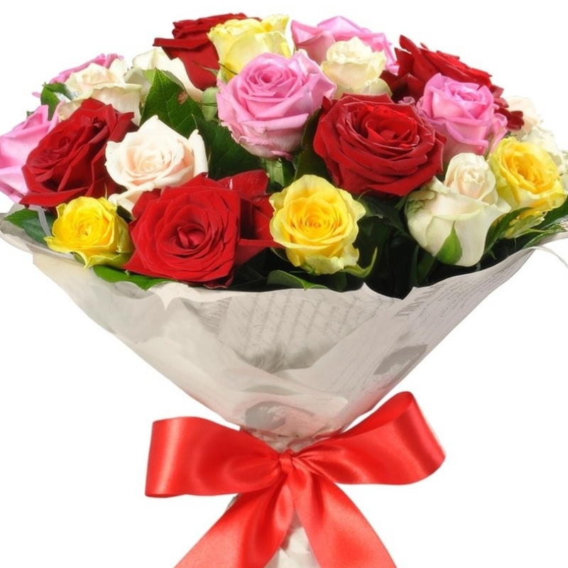 Букет состоит из 6 красных роз, 5 белых роз, 5 желтых роз, 5 розовых роз, крафт, красная лента.