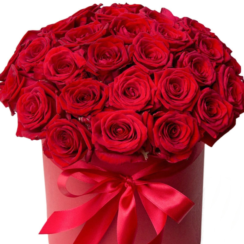 35 красных роз, коробка, оазис, лента.