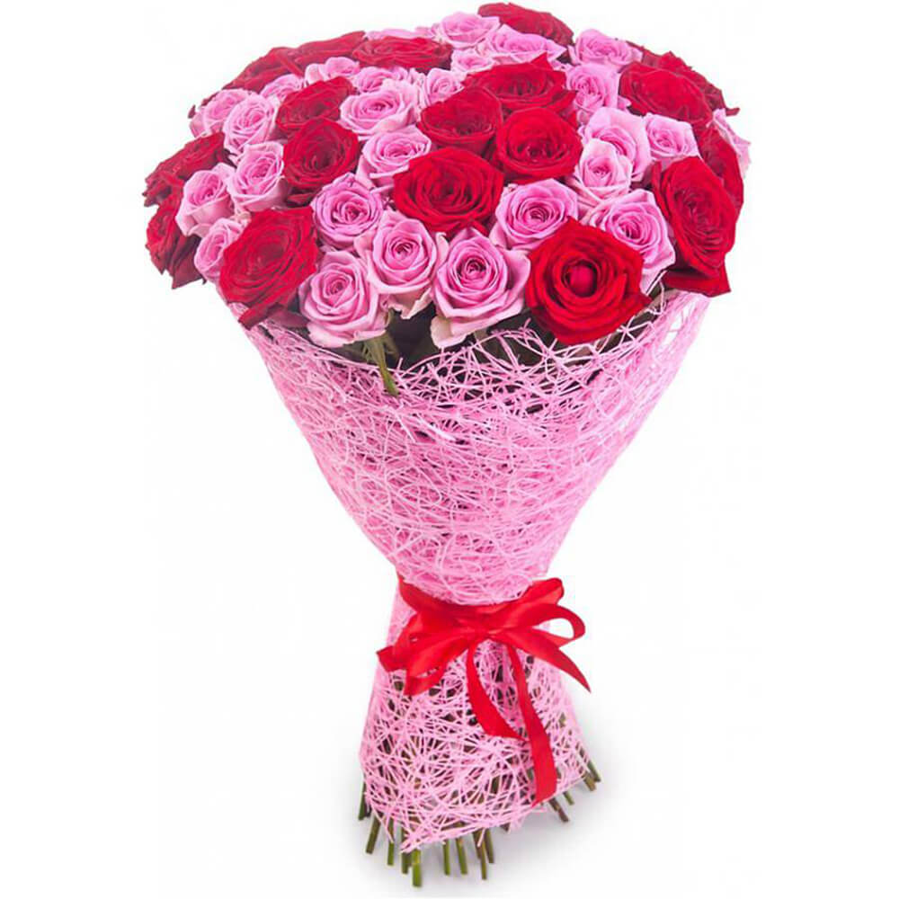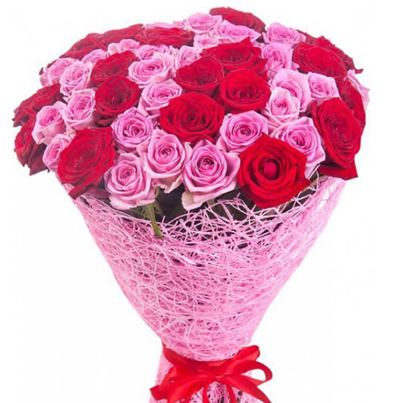 Букет состоит из 23 красные розы, 22 розовые розы, красивая упаковка, прозрачная лента.