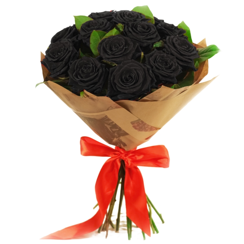 Букет состоит из 13 черных роз, зелень, крафт, атласная лента.