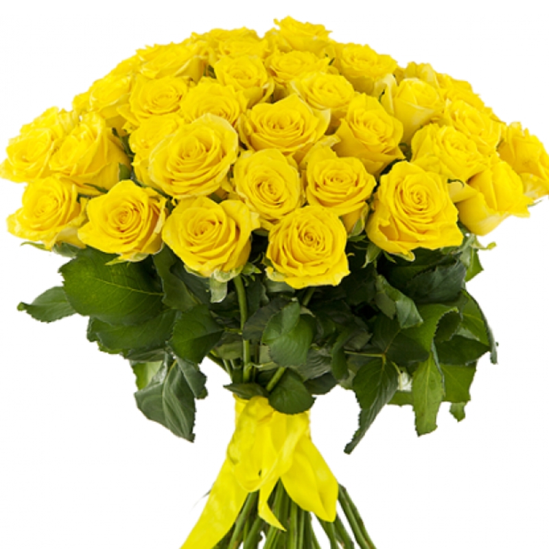 Букет состоит из 31 желтая роза, прозрачная упаковка, атласная лента.