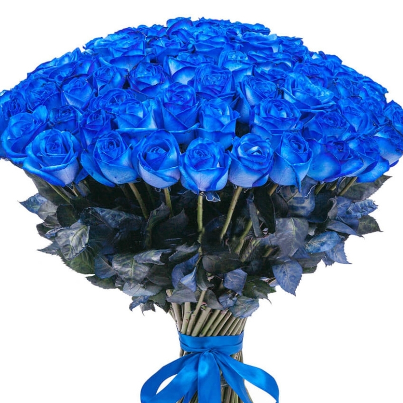 Букет состоит из 101 синяя роза, прозрачная упаковка, атласная лента.