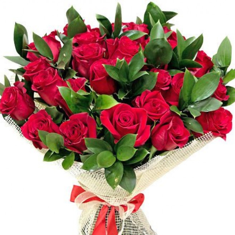 Букет состоит из 35 розовых роз, рускус, красивая упаковка, атласная лента.