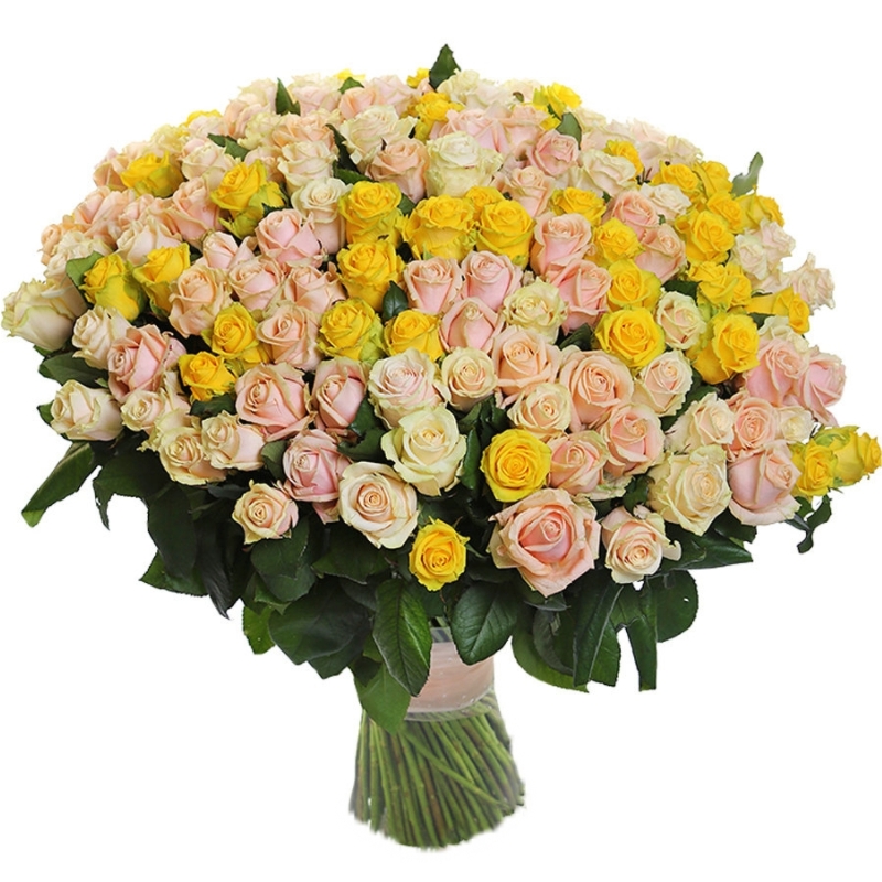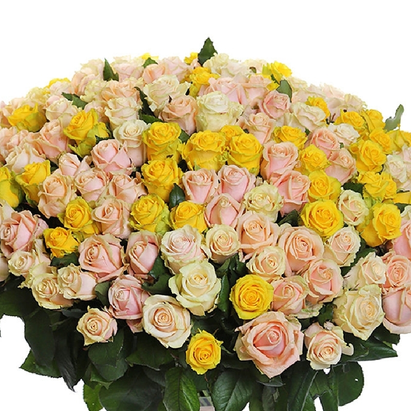 Букет состоит из MIX из 201 розы, прозрачная упаковка, атласная лента.