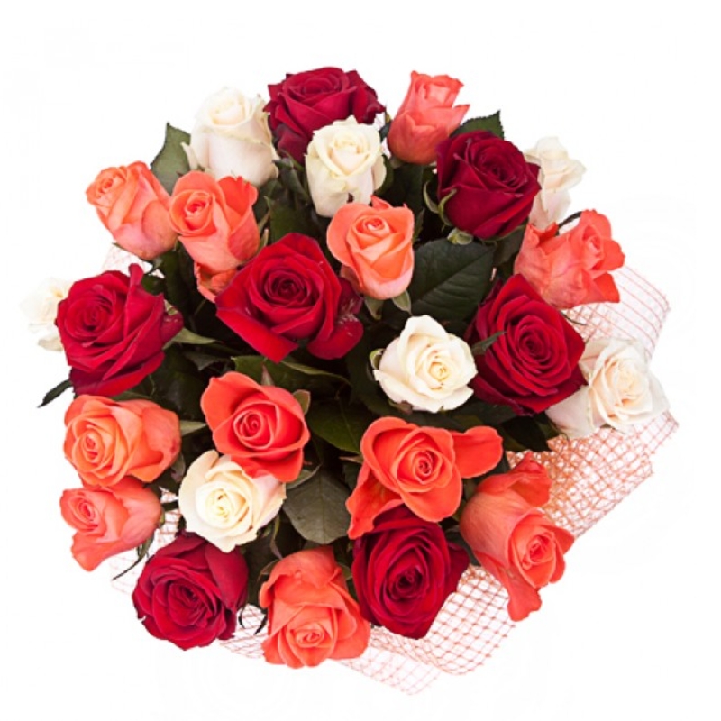 Букет состоит из MIX из 25 роз, сетка, атласная лента.