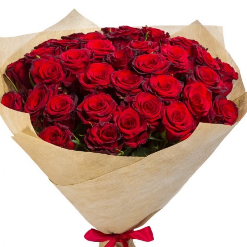 Букет состоит из 45 красных роз, крафт, атласная лента.