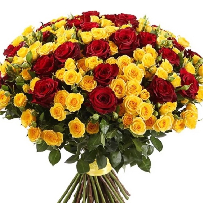 Букет состоит из 31 красная роза, 30 желтых кустовых роз, прозрачная упаковка, атласная лента.