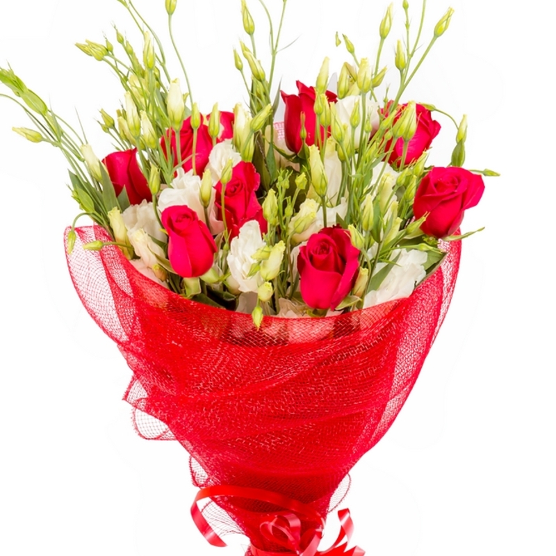 Букет состоит из 9 красных роз, 6 веток эустомы, упаковка, лента.