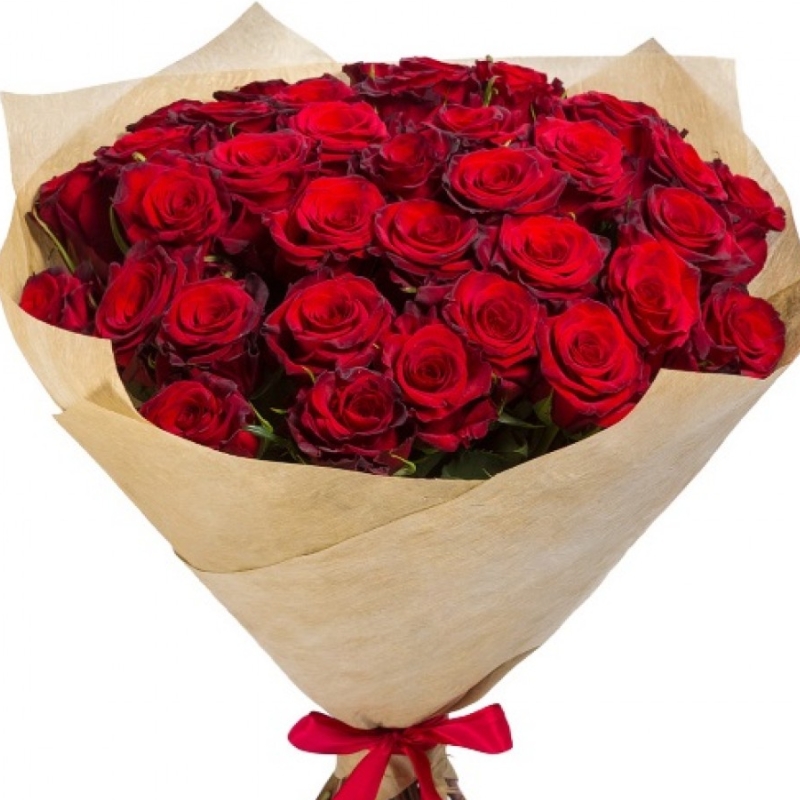 Букет состоит из 31 красная роза, крафт, атласная лента.