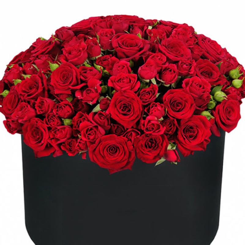 Букет состоит из 35 красных роз, 20 кустовых роз, коробка, оазис.