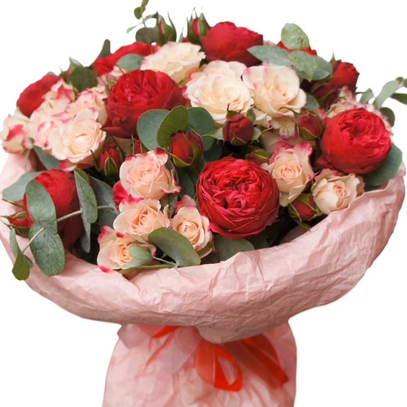 Букет состоит из 6 розовых кустовых роз, 5 красных пионовидных кустовых роз, эвкалипт, крафт, атласная лента.