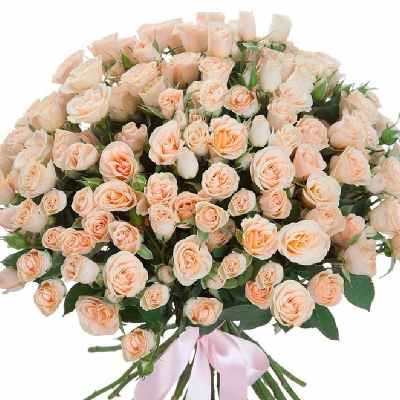 Букет состоит из 25 кустовых кремовых роз, прозрачная упаковка, атласная лента.
