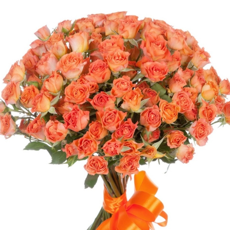 Букет состоит из 21 оранжевая кустовая роза, прозрачная упаковка, атласная лента.