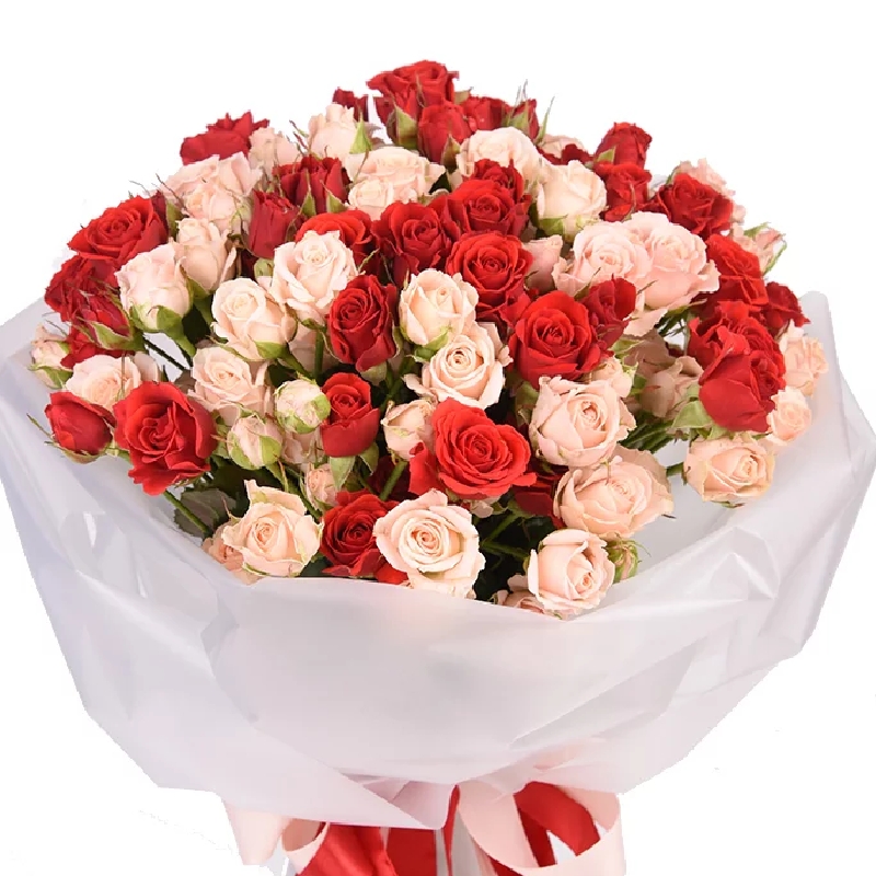Букет состоит из MIX из 21 красной и кремовой кустовой розы, красивая упаковка, атласная лента.