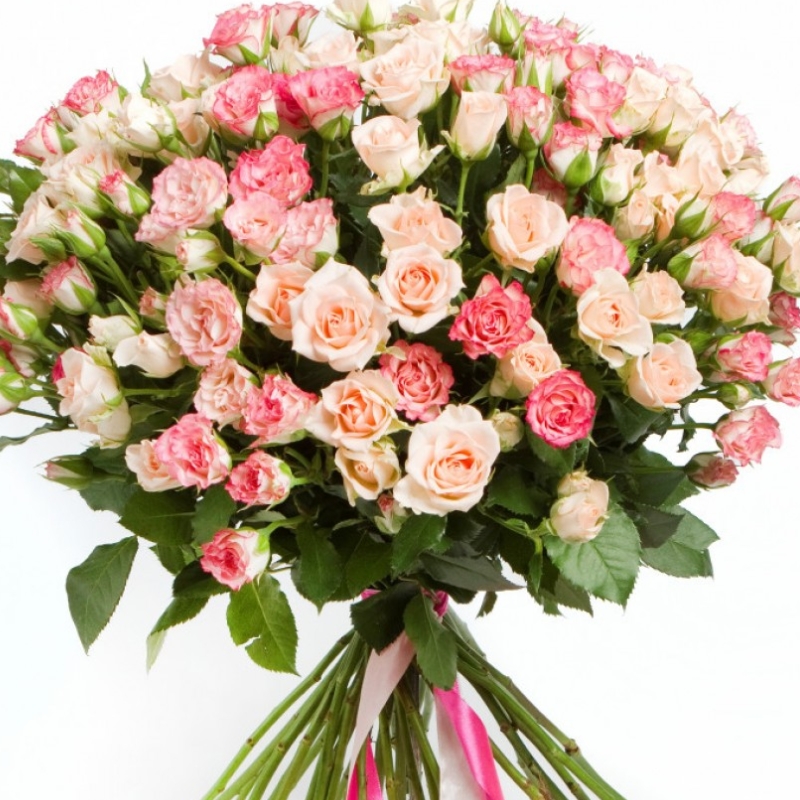 Букет состоит из MIX из 35 розовых и кремовых кустовых роз, прозрачная упаковка, атласная лента.