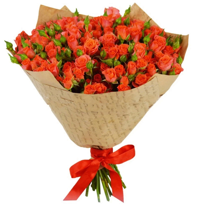 Букет состоит из 21 оранжевая кустовая роза, крафт, атласная лента.
