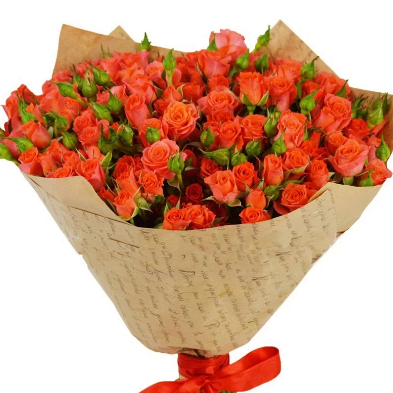 Букет из 21 оранжевой кустовой розы в крафте