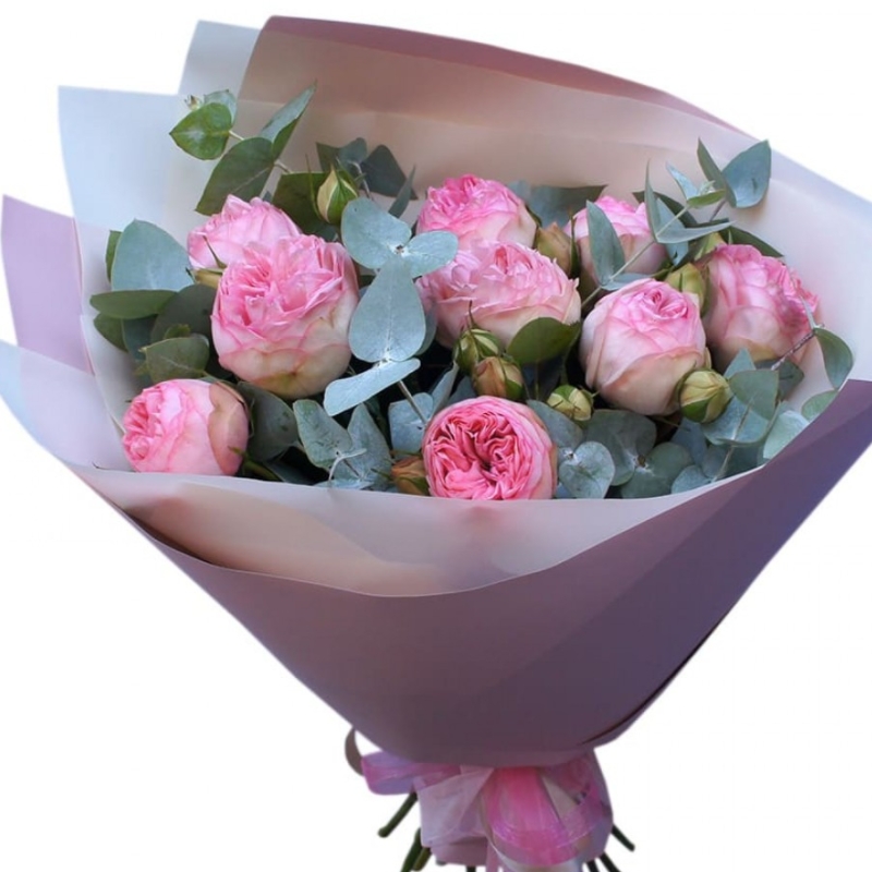 Букет состоит из 9 кустовых пионовидных роз, эвкалипт, красивая упаковка, атласная лента.