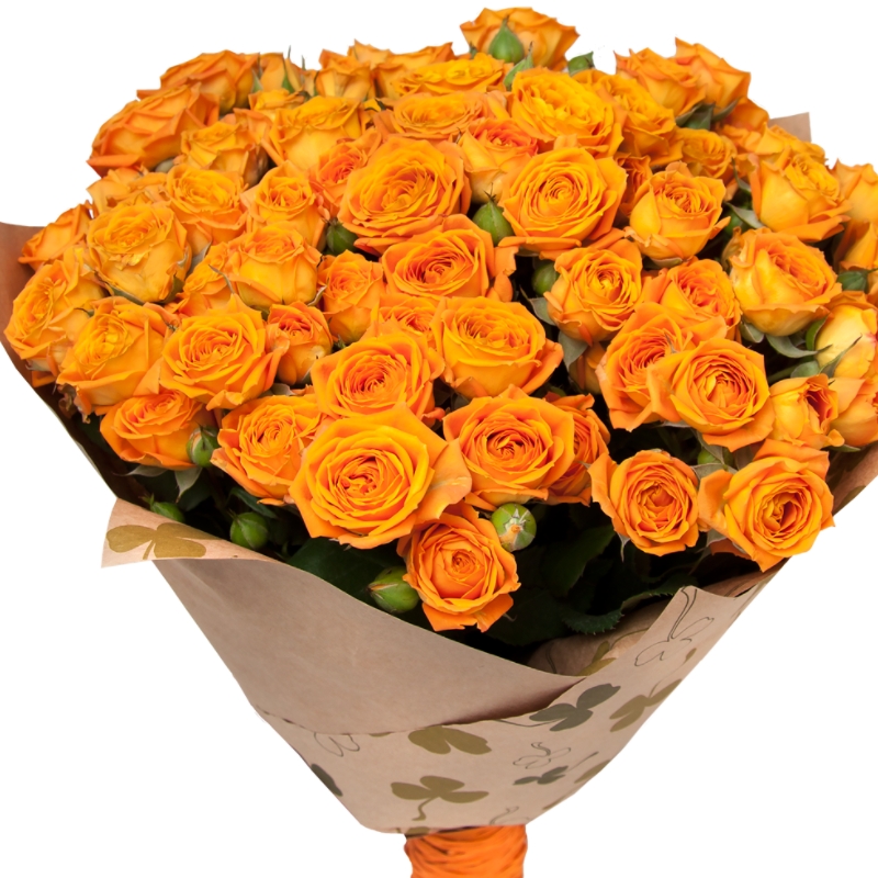 Букет состоит из 17 оранжевых кустовых роз, крафт, атласная лента.